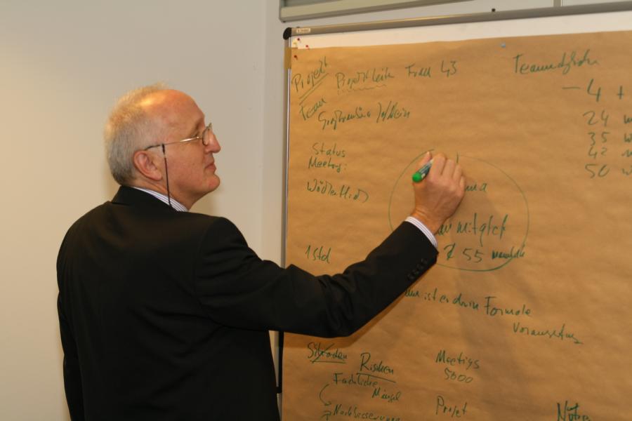 14.10.2010 Sokratischer Dialog in der Praxis: Umgang mit Proforma-Teammitgliedern Bei einer Informationsveranstaltung im Complex in Fürth hat die Dialog für Entscheider GbR Personalverantwortlichen den Nutzen der sokratischen Gesprächsmethode aufgezeigt. Die drei Inhaber des Unternehmens, Carsten Lange, Michael Klische und Otmar Potjans führten zunächst mit Vorträgen in das Thema ein. Anschließend moderierten sie ein sokratisches Gespräch anhand eines Praxisbeispiels, das von den Teilnehmern vorgeschlagen wurde: Wie kann man mit Proforma-Teammitgliedern sinnvoll umgehen? Typische Bestandteile eines sokratischen Dialogs sind Begriffsklärung, Hinterfragen, Verallgemeinerung, Metakommunikation und Visualisierung. Das Foto zeigt Otmar Potjans beim Festhalten der Ergebnisse während der Veranstaltung.